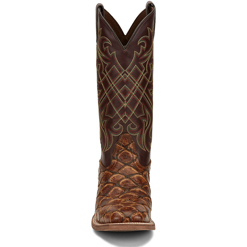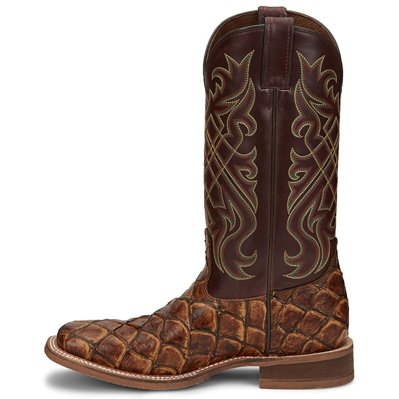 A dynamic and impressive boot with distinguished exotic style. The 13" Bryce in Maple from our Hero collection is a commanding square toe boot featuring an exotic fish scale print foot inspired by one of the legendary giants of the Amazon. It's teamed with an expertly stitched shaft with bold, regal flair for rodeo-ready style. This boot is lined with leather for a natural, breathable feel. Removable orthotic insoles keep your feet comfortable, and the durable rubber outsole is ready for anything.