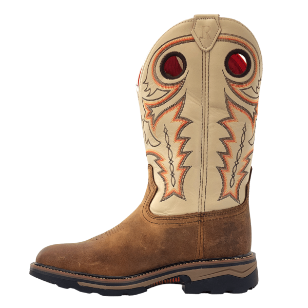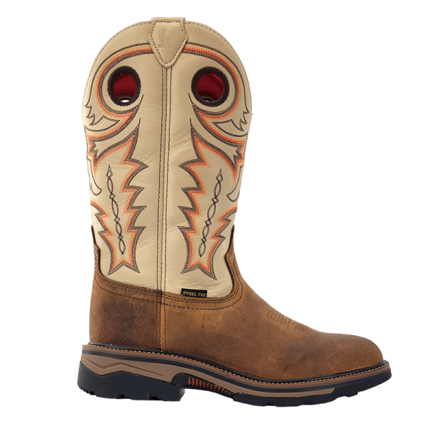 R. Watson presents these buffalo and cowhide wide square steel toe work boots. These work boots have a 10 row stitch pattern, removable orthotic insole, EVA midsole, medium duty rubber outsole. They are EH, slip and oil resistant. 12" total in height.