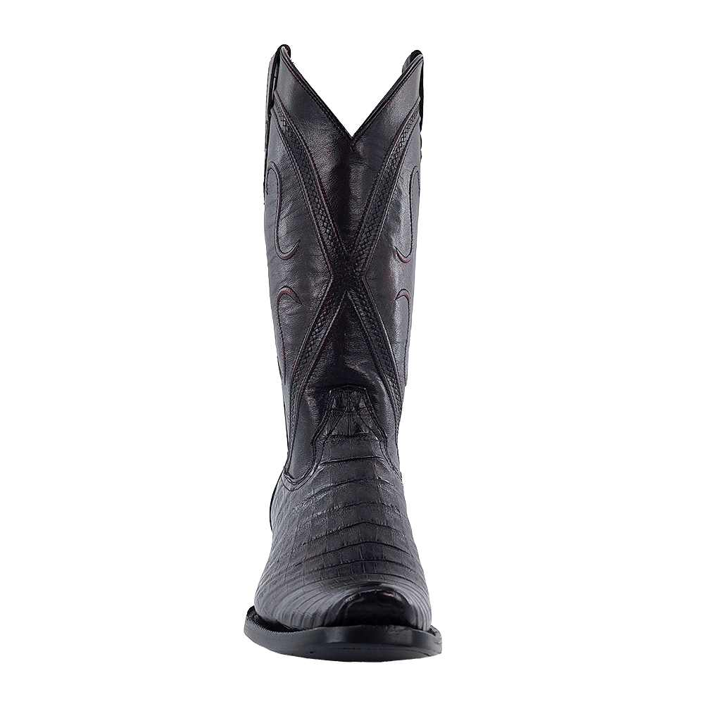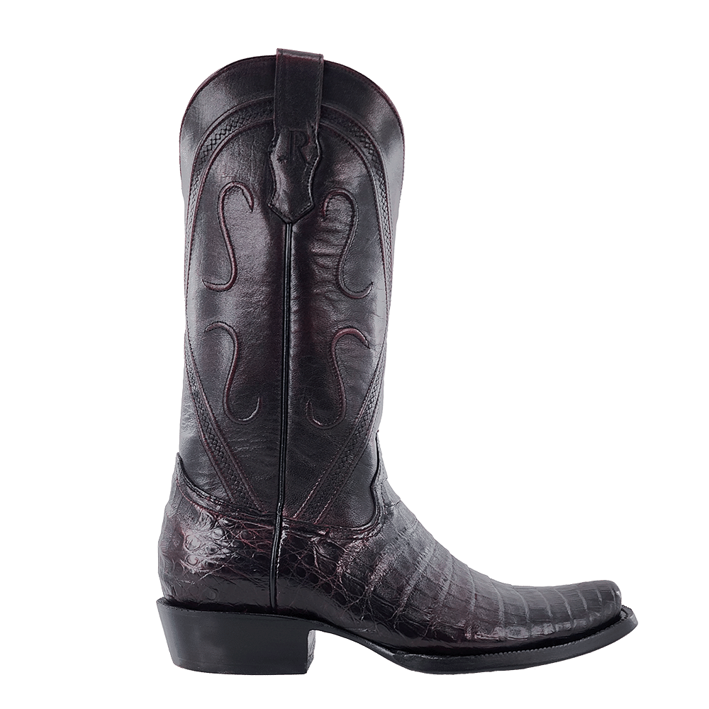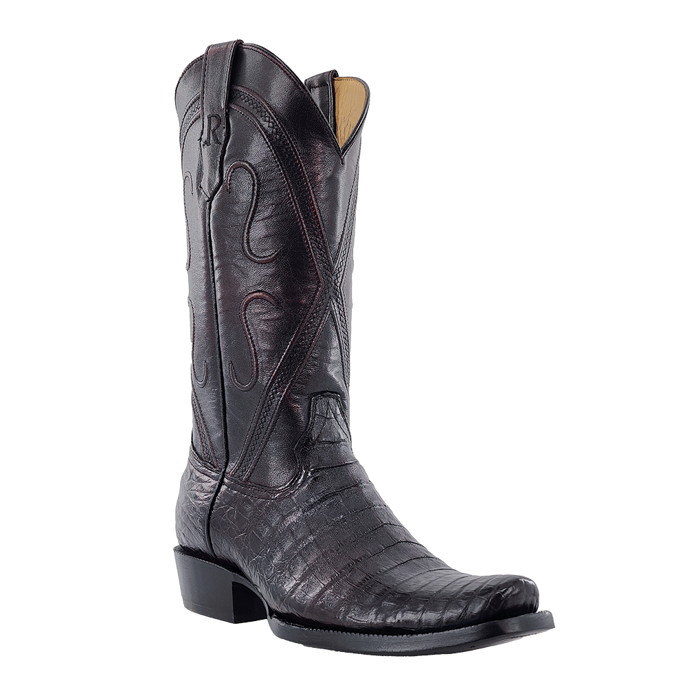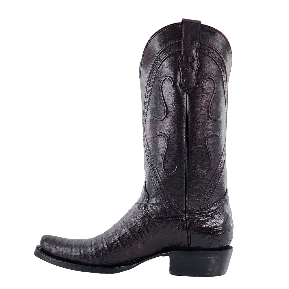 R. Watson presents these caiman belly and brush off goat exotic western boots. These boots have a corded stitch pattern, R. Watson comfort system, all leather stacked heel, counters, solid steel shank, and 10 iron outsole. 13" total in height.
