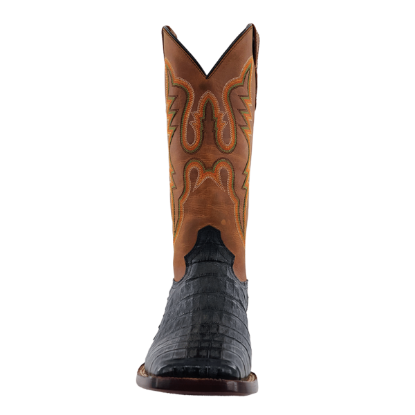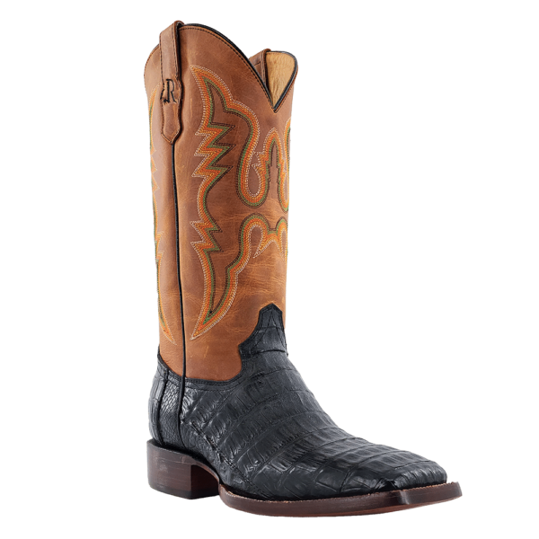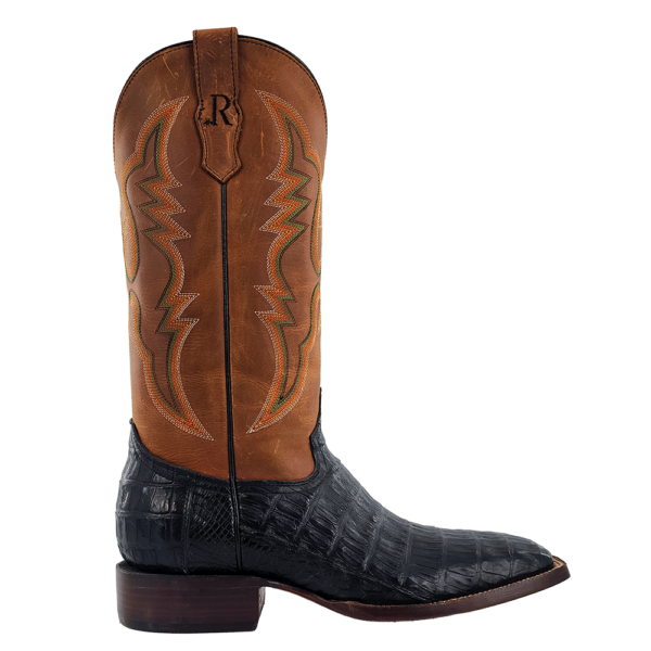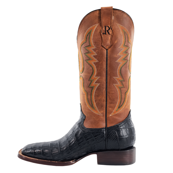 R. Watson presents these caiman tail and cowhide exotic western boots. These boots have a 10 row stitch pattern, R. Watson comfort system, all leather stacked heel, counters, solid steel shank, and 10 iron outsole. 13" total in height.