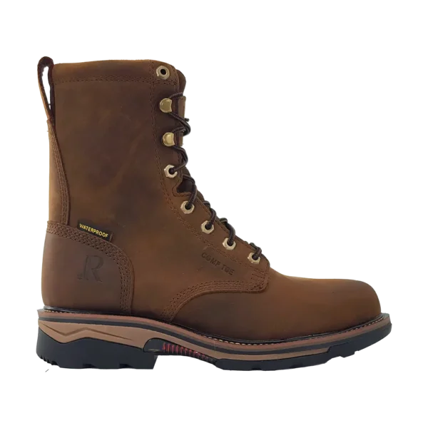 R. Watson presents these cowhide round toe, waterproof work boots. These work boots have a 10 row stitch pattern, removable orthotic insole, EVA midsole, Vibram unit sole. They are EH, slip and oil resistant. 8" total in height.