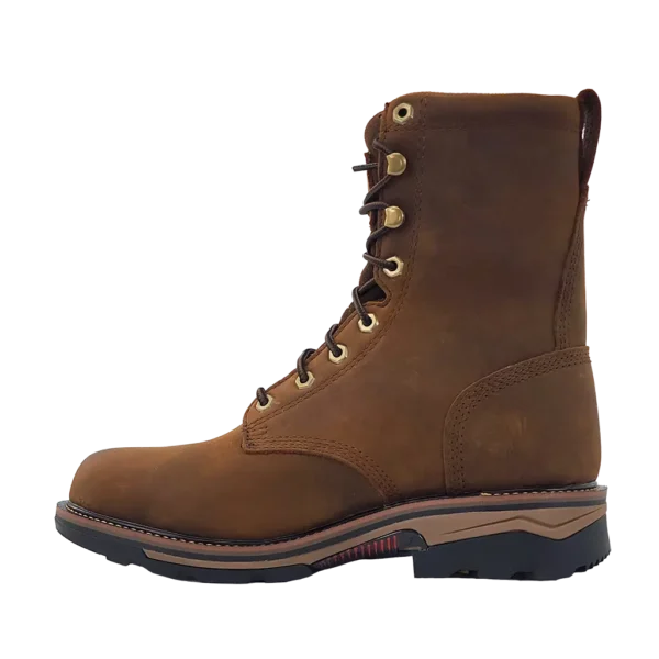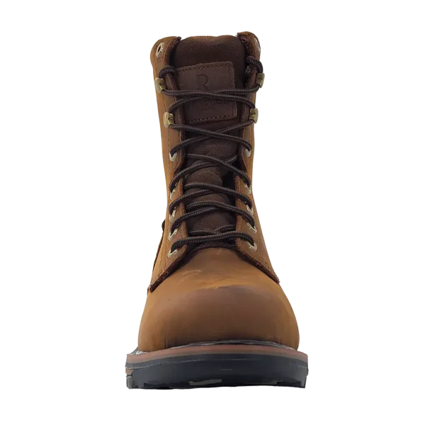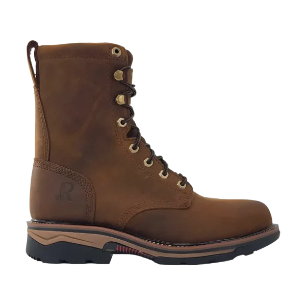 R. Watson presents these cowhide lace up round toe work boots. These work boots have a removable orthotic insole, EVA midsole, and a block heel. They are EH, slip and oil resistant. 8" total in height.