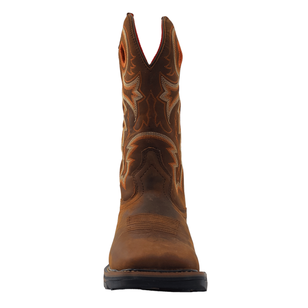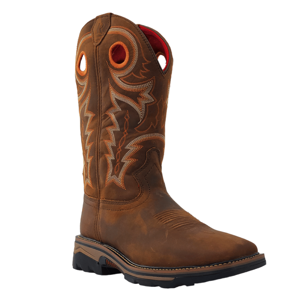 R. Watson presents these cowhide wide square steel toe, waterproof work boots. These work boots have a 10 row stitch pattern, removable orthotic insole, EVA midsole, medium duty rubber outsole. They are EH, slip and oil resistant. 12" total in height.