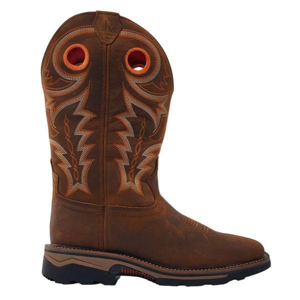 R. Watson presents these cowhide wide square toe, waterproof work boots. These work boots have a 10 row stitch pattern, removable orthotic insole, EVA midsole, medium duty rubber outsole. They are EH, slip and oil resistant. 12" total in height.