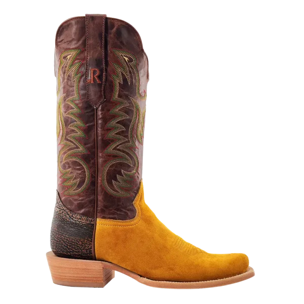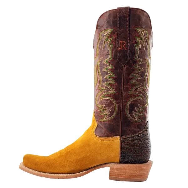 R. Watson presents these deer and cowhide exotic western boots. These boots have a 10 row stitch pattern, R. Watson comfort system, all leather stacked heel, counters, solid steel shank, and 10 iron outsole. 13" total in height.