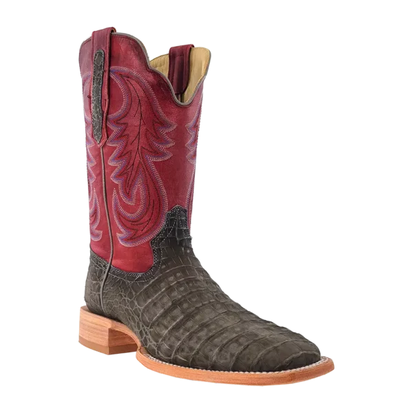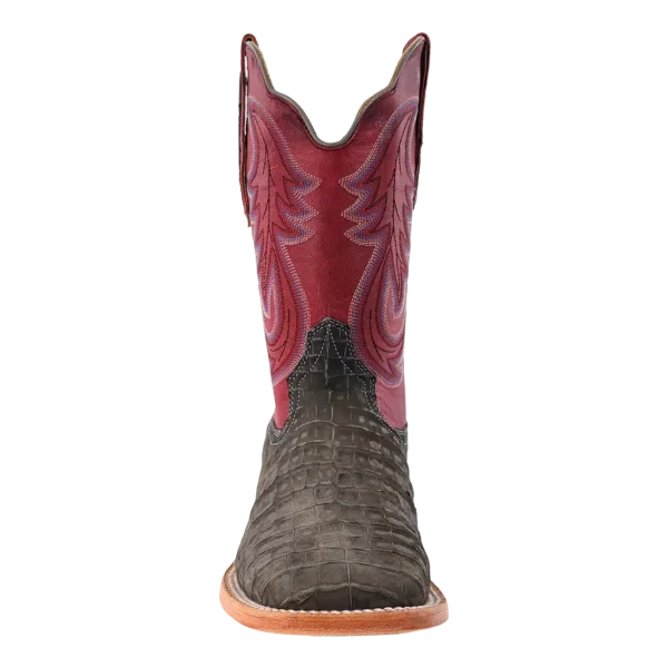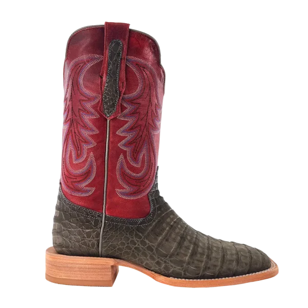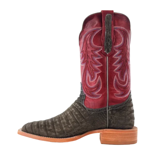 R. Watson presents these nubuck caiman and Rosa calf exotic western boots. These boots have a corded stitch pattern, R. Watson comfort system, all leather stacked heel, counters, solid steel shank, and 10 iron outsole. 11" total in height.