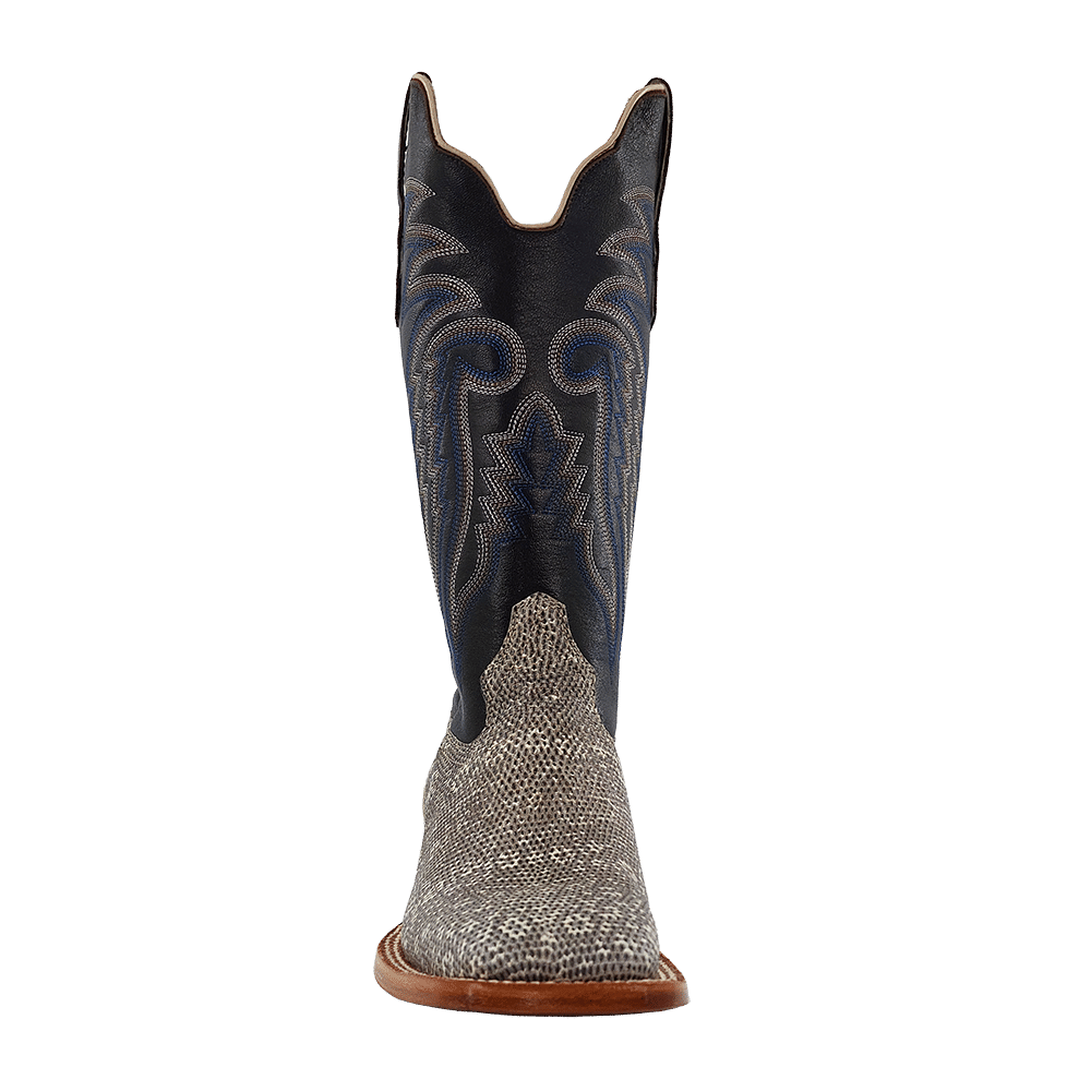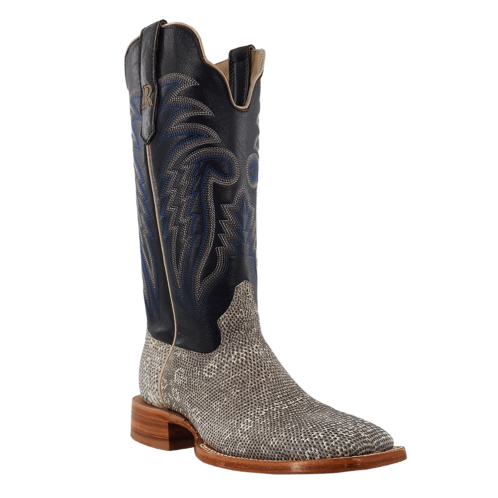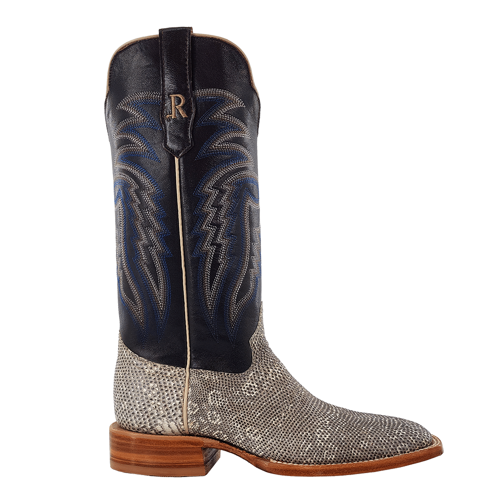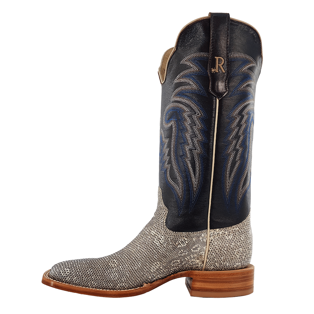 R. Watson presents these ringtail lizard and cow exotic western boots. These boots have a 10 row stitch pattern, R. Watson comfort system, all leather stacked heel, counters, solid steel shank, and 10 iron outsole. 13" total in height.