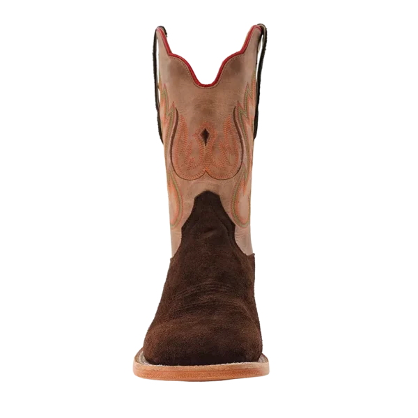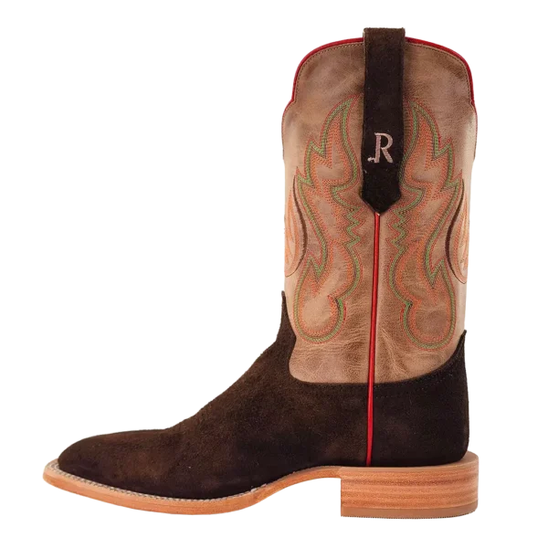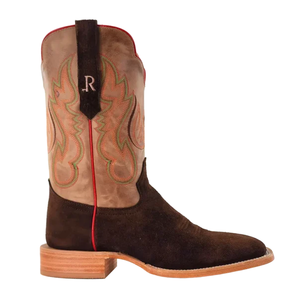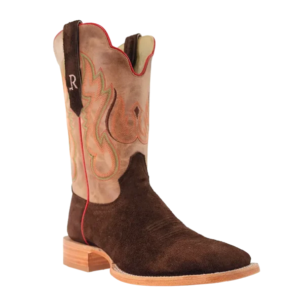 R. Watson presents these roughout and cowhide western boots. These boots have a 10 row stitch pattern, R. Watson comfort system, all leather stacked heel, counters, solid steel shank, and 10 iron outsole. 11" total in height.