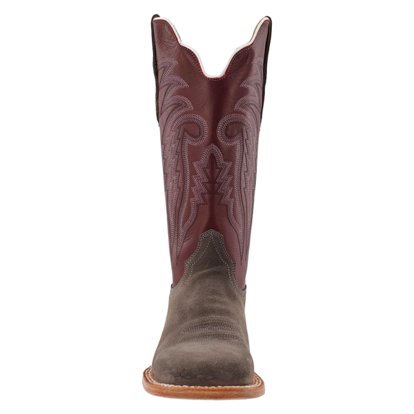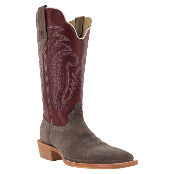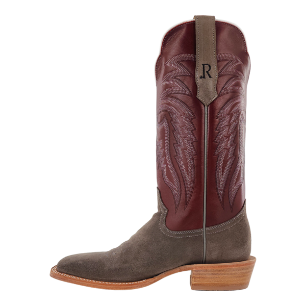 R. Watson presents these roughout and cowhide western boots. These boots have a 10 row stitch pattern, R. Watson comfort system, all leather stacked heel, counters, solid steel shank, and 10 iron outsole. 13" total in height.