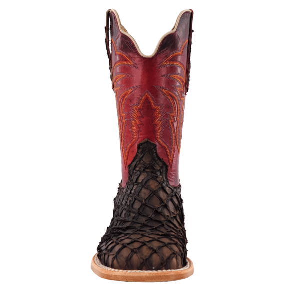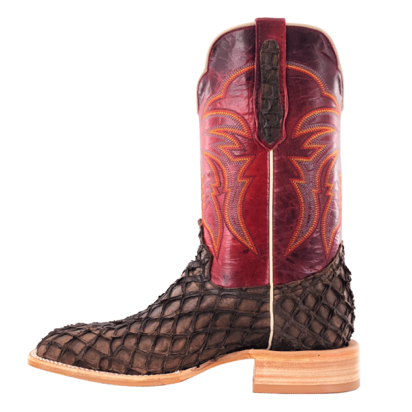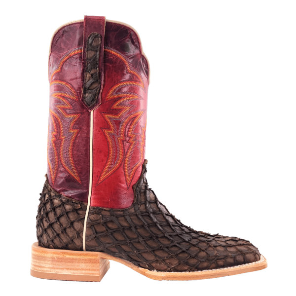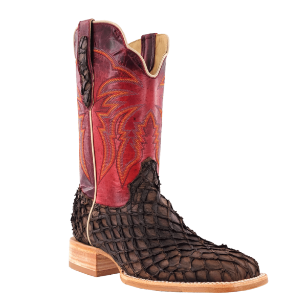 R. Watson presents these pirarucu and cowhide/goat western boots. These boots have a 10 row stitch pattern, R. Watson comfort system, all leather stacked heel, counters, solid steel shank, and 10 iron outsole. 11" total in height.