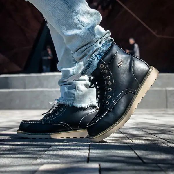You can't go wrong with this handsome moc toe 6 inch boot. This will become your shoe of choice on whichever street you may be traveling. And travel far with this comfort wedge, slip resistant outsole that is built to last. Step into the Roamer Hi whether you're wearing your jeans, khakis or shorts - Looking good never felt so good.