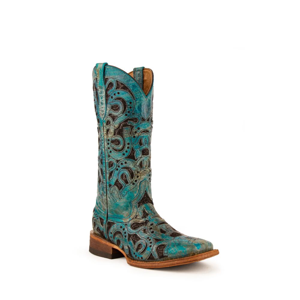 This distressed leather turquoise boot accented with black shimmer inlay is truly all-Western with its intricate horseshoe stitch design from top to bottom. A perfect Western statement in color and style.