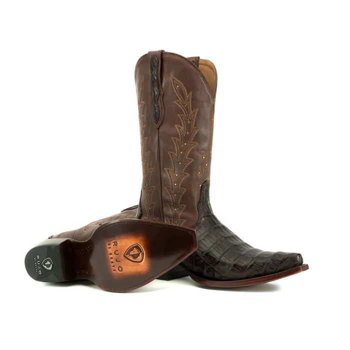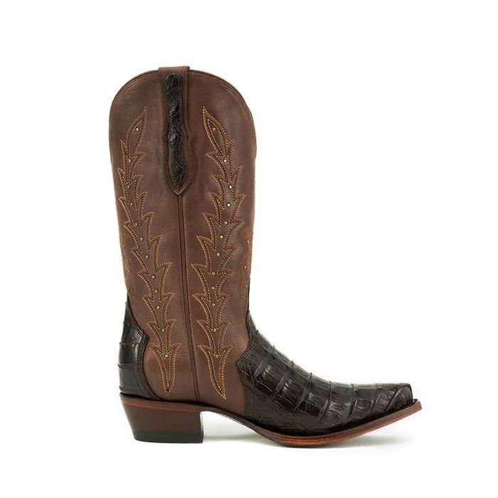 This little lady will be the center of attention. A gorgeous Caiman tail vamp is topped off with a stitched twelve inch calfskin shaft and highlighted with decorative studding. KELLI kicks things off with a snip toe in Midnight black or Chocolate brown choices. Every step is a statement!